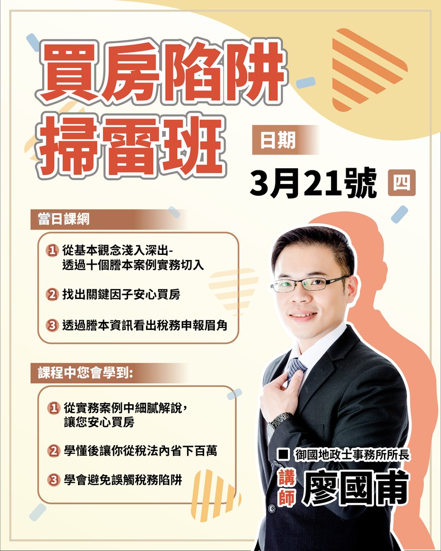 課程課網: 1、從基本觀念淺入深出-透過十個謄本案例實務切入 2、找出關鍵因子安心買房 3、透過謄本資訊看出稅務申報眉角